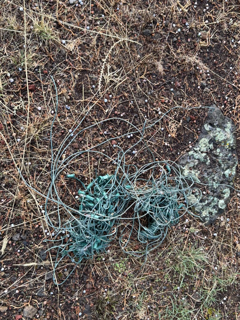 I stopped to chat with the three onlookers. The man with the gun turned out to be a fish and wildlife biologist, and the two officers from the state police game department. They had been alerted to the buck’s predicament and had come to help. Steve, (the biologist) had just darted it, and now they were waiting for the tranquilliser to take effect. My run is about two and half miles out and back, the turn around point was just a little further on, so as it was a bit chilly to be standing around, I decided to carry on. Hopefully by the time I returned I would be able to see what was holding the living and dead together. My timing was spot on, when I got back to the scene the large buck was out cold and one of the officers was snipping away at what was binding them together. I peered over the fence. Again, I thought my eyes were deceiving me. “That looks like Christmas lights?” It was! A great bundle of wire wrapped tightly around their antlers, bound them together, but far from offering them any glimmer of cheer these lights held only the gloomy prospect of death. The irony of death by Christmas lights!